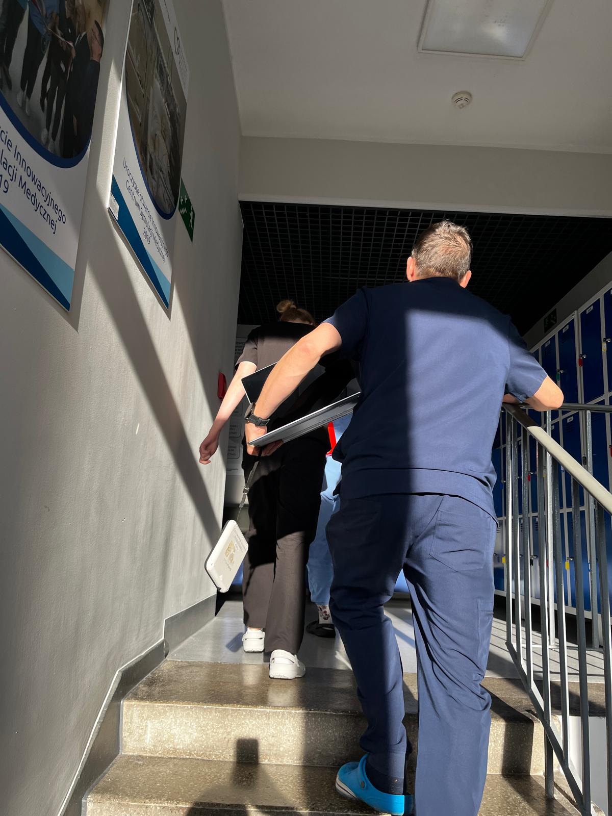 Podczas wczorajszych zajęć praktycznych studenci II roku kierunku pielęgniarstwo mieli okazję przećwiczyć metody ewakuacji pacjenta po skutecznej resuscytacji z wykorzystaniem deski ortopedycznej oraz materaca próżniowego. Ćwiczenia były wymagające nie tylko pod względem wiedzy i umiejętności, ale również kondycji fizycznej. Symulator o wadze 30 kg, pełne wyposażenie medyczne – plecak ratowniczy, defibrylator manualny, respirator, torba tlenowa (o wadze kilkudziesięciu kilogramów!) – oraz trzyosobowy zespół studentów stworzyły realistyczne warunki pracy ratowników. Aby sprostać takim wyzwaniom, przyszli medycy muszą dbać nie tylko o rozwój zawodowy, ale również o dobrą kondycję fizyczną, zdrowy styl życia i zbilansowaną dietę.