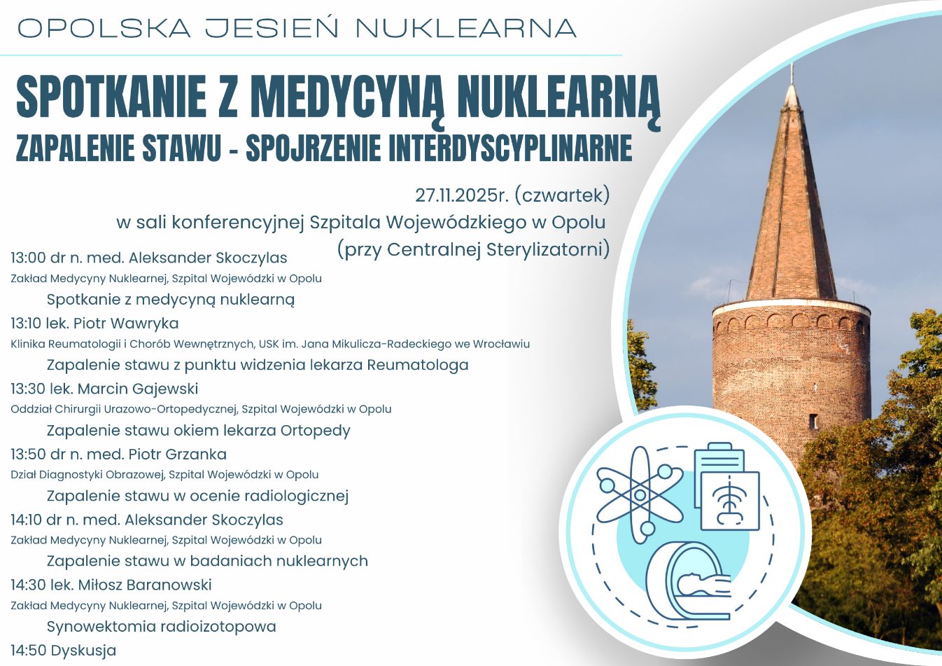 Serdecznie zapraszamy do udziału w wydarzeniu „Spotkanie z Medycyną Nuklearną: Zapalenie stawu – spojrzenie interdyscyplinarne”, które odbędzie się 27 listopada 2025 r. od godziny 13:00 w sali konferencyjnej Szpitala Wojewódzkiego w Opolu (przy Centralnej Sterylizatorni).